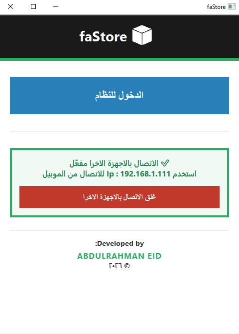 هذه الواجهة الرئيسي لبرنامج faStore على جهاز الكمبيوتر . من هنا يمكنك التحكم في تشغيل النظام علي الكمبيوتر او السيرفر علي الموبيل.